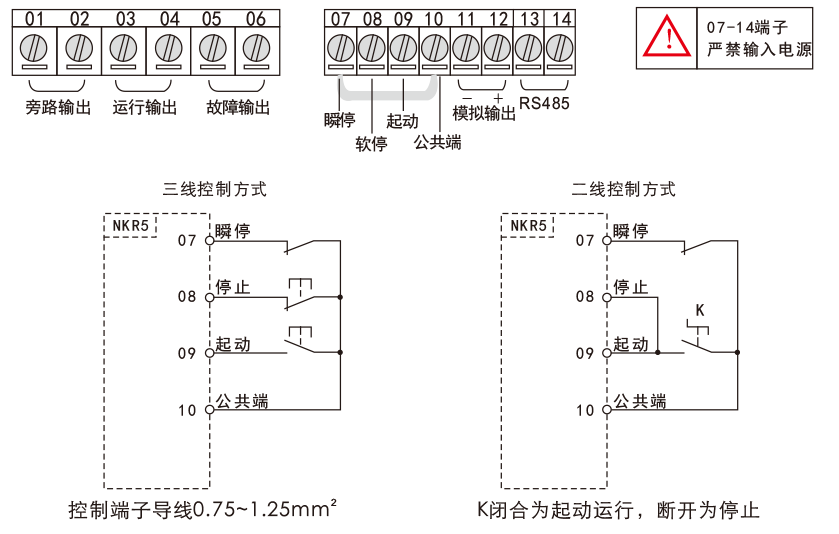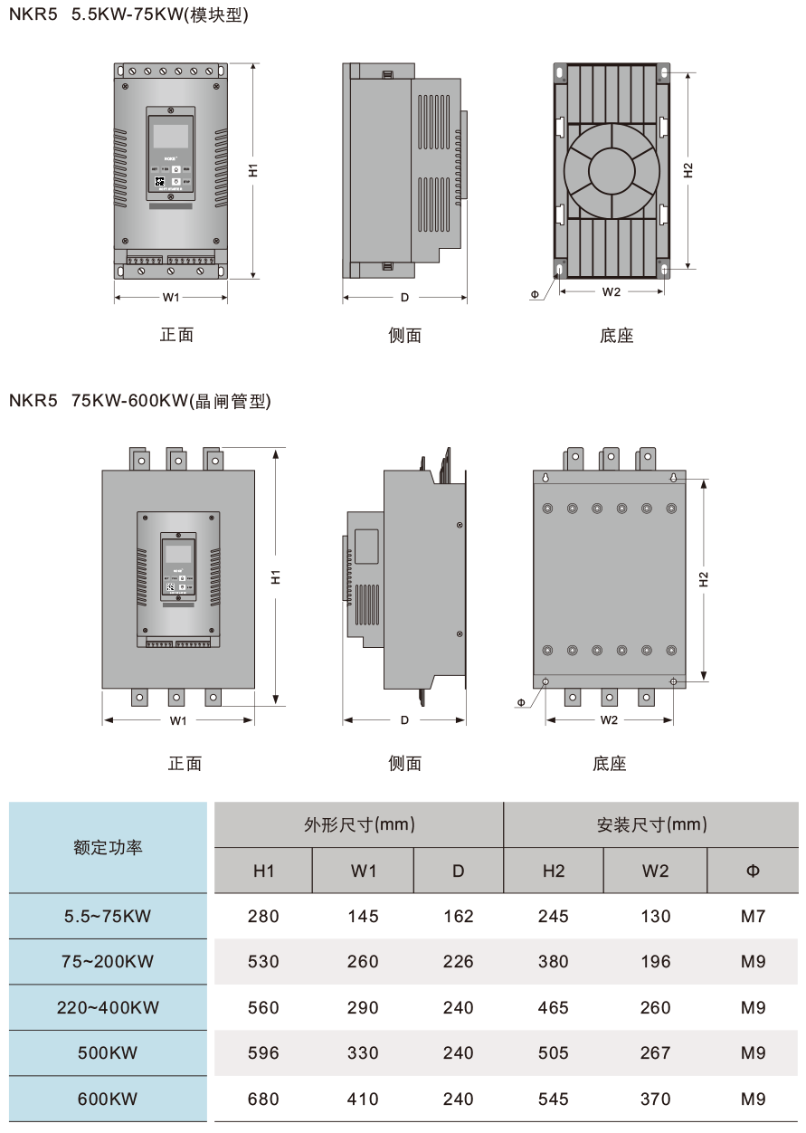 NKR5 系列中文软起动器正是以先进的微处理器为核心,应用先进的软件设计方法和最新的硬件技术,采用晶闸管相移技术,实现交流异步电动机的软起动、软停车功能,同时具有断相、过压、欠压、过流、过载、三相不平衡、短路等多项保护功能。